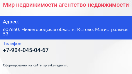 Мир недвижимости, агентство недвижимости по адресу 607650, Нижегородская область, Кстово, Магистральная, 53 в дальнейшем Организация, размещена в следующих категориях: