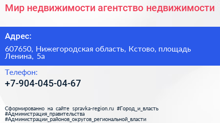 Мир недвижимости, агентство недвижимости по адресу 607650, Нижегородская область, Кстово, площадь Ленина, 5а в дальнейшем Организация, размещена в следующих категориях: