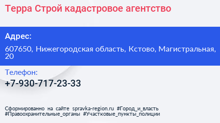 Терра-Строй, кадастровое агентство по адресу 607650, Нижегородская область, Кстово, Магистральная, 20 в дальнейшем Организация, размещена в следующих категориях: