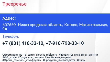 Трехречье по адресу 607650, Нижегородская область, Кстово, Магистральная, 4д в дальнейшем Организация, размещена в следующих категориях: