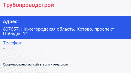 Трубопроводстрой по адресу 607657, Нижегородская область, Кстово, проспект Победы, 14 в дальнейшем Организация, размещена в следующих категориях: