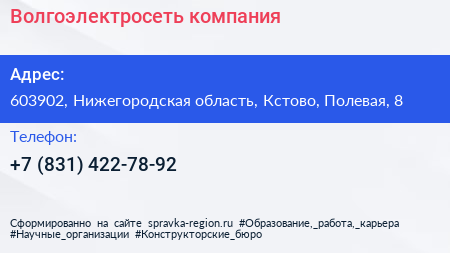 Волгоэлектросеть, компания по адресу 603902, Нижегородская область, Кстово, Полевая, 8 в дальнейшем Организация, размещена в следующих категориях: