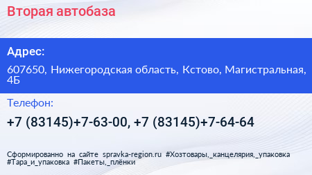 Вторая автобаза по адресу 607650, Нижегородская область, Кстово, Магистральная, 4Б в дальнейшем Организация, размещена в следующих категориях: