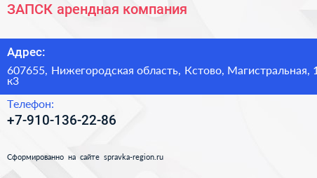 ЗАПСК, арендная компания по адресу 607655, Нижегородская область, Кстово, Магистральная, 1 к3 в дальнейшем Организация, размещена в следующих категориях: