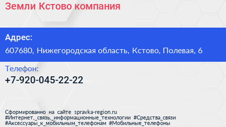 Земли Кстово, компания по адресу 607680, Нижегородская область, Кстово, Полевая, 6 в дальнейшем Организация, размещена в следующих категориях: