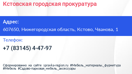 Кстовская городская прокуратура по адресу 607650, Нижегородская область, Кстово, Чванова, 1 в дальнейшем Организация, размещена в следующих категориях: