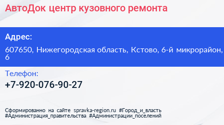 АвтоДок, центр кузовного ремонта по адресу 607650, Нижегородская область, Кстово, 6-й микрорайон, 6 в дальнейшем Организация, размещена в следующих категориях: