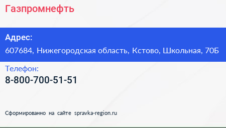 Газпромнефть по адресу 607684, Нижегородская область, Кстово, Школьная, 70Б в дальнейшем Организация, размещена в следующих категориях: