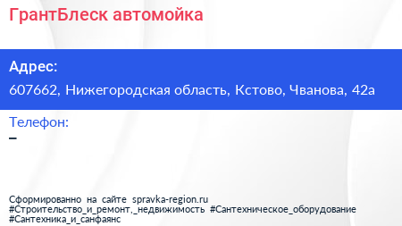 ГрантБлеск, автомойка по адресу 607662, Нижегородская область, Кстово, Чванова, 42а в дальнейшем Организация, размещена в следующих категориях: