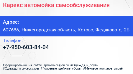Карекс, автомойка самообслуживания по адресу 607686, Нижегородская область, Кстово, Федяково с, 2Б в дальнейшем Организация, размещена в следующих категориях: