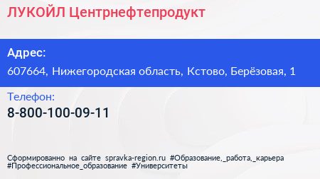 ЛУКОЙЛ-Центрнефтепродукт по адресу 607664, Нижегородская область, Кстово, Берёзовая, 1 в дальнейшем Организация, размещена в следующих категориях: