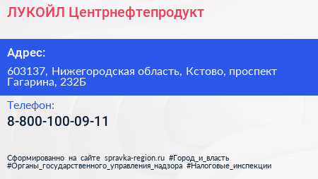 ЛУКОЙЛ-Центрнефтепродукт по адресу 603137, Нижегородская область, Кстово, проспект Гагарина, 232Б в дальнейшем Организация, размещена в следующих категориях: