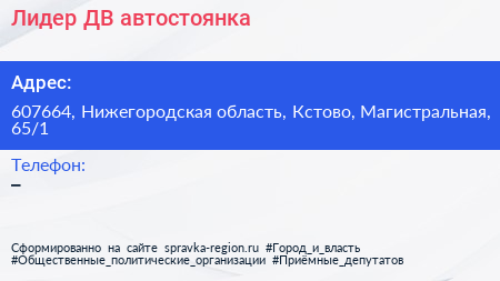 Лидер ДВ, автостоянка по адресу 607664, Нижегородская область, Кстово, Магистральная, 65/1 в дальнейшем Организация, размещена в следующих категориях: