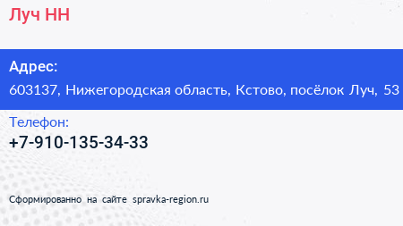 Луч-НН по адресу 603137, Нижегородская область, Кстово, посёлок Луч, 53 в дальнейшем Организация, размещена в следующих категориях: