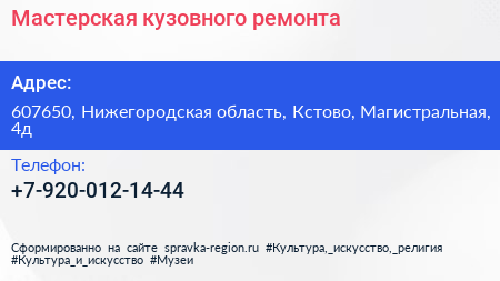 Мастерская кузовного ремонта по адресу 607650, Нижегородская область, Кстово, Магистральная, 4д в дальнейшем Организация, размещена в следующих категориях:
