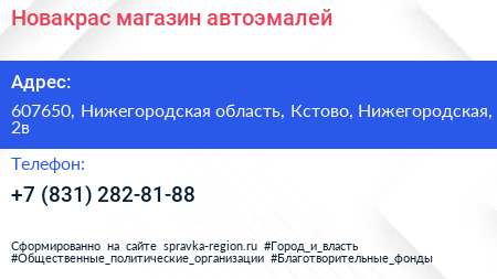 Новакрас, магазин автоэмалей по адресу 607650, Нижегородская область, Кстово, Нижегородская, 2в в дальнейшем Организация, размещена в следующих категориях: