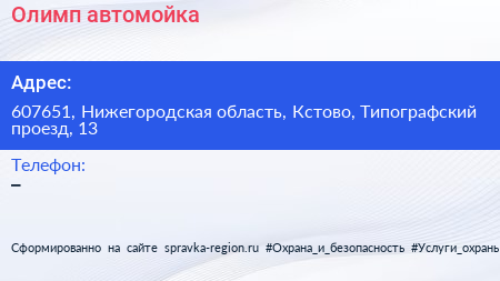 Олимп, автомойка по адресу 607651, Нижегородская область, Кстово, Типографский проезд, 13 в дальнейшем Организация, размещена в следующих категориях: