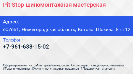 Pit Stop, шиномонтажная мастерская по адресу 607661, Нижегородская область, Кстово, Шохина, 8 ст12 в дальнейшем Организация, размещена в следующих категориях: