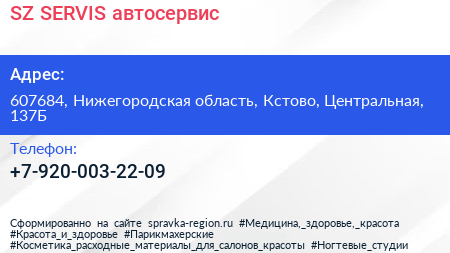 SZ SERVIS, автосервис по адресу 607684, Нижегородская область, Кстово, Центральная, 137Б в дальнейшем Организация, размещена в следующих категориях: