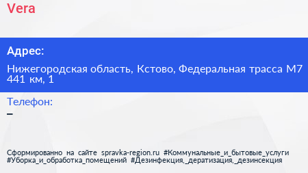 Vera по адресу Нижегородская область, Кстово, Федеральная трасса М7 441 км, 1 в дальнейшем Организация, размещена в следующих категориях: