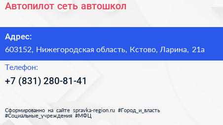 Автопилот, сеть автошкол по адресу 603152, Нижегородская область, Кстово, Ларина, 21а в дальнейшем Организация, размещена в следующих категориях: