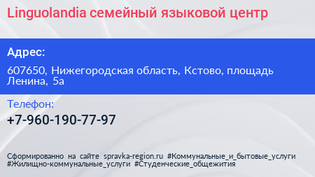 Linguolandia, семейный языковой центр по адресу 607650, Нижегородская область, Кстово, площадь Ленина, 5а в дальнейшем Организация, размещена в следующих категориях: