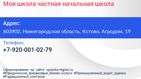 Моя школа, частная начальная школа по адресу 603902, Нижегородская область, Кстово, Агродом, 19 в дальнейшем Организация, размещена в следующих категориях: