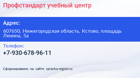 Профстандарт, учебный центр по адресу 607650, Нижегородская область, Кстово, площадь Ленина, 5а в дальнейшем Организация, размещена в следующих категориях: