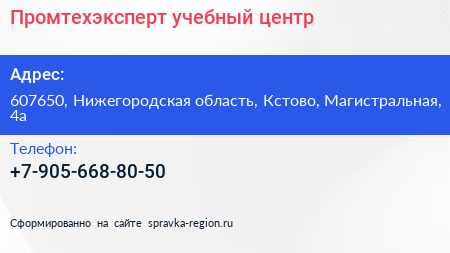 Промтехэксперт, учебный центр по адресу 607650, Нижегородская область, Кстово, Магистральная, 4а в дальнейшем Организация, размещена в следующих категориях: