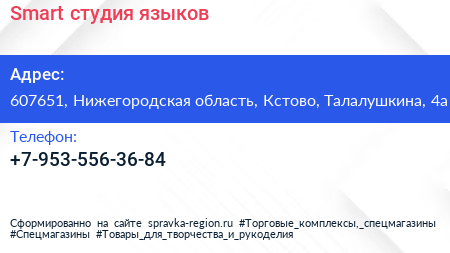 Smart, студия языков по адресу 607651, Нижегородская область, Кстово, Талалушкина, 4а в дальнейшем Организация, размещена в следующих категориях: