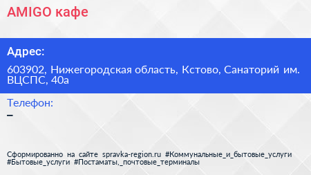 AMIGO, кафе по адресу 603902, Нижегородская область, Кстово, Санаторий им. ВЦСПС, 40а в дальнейшем Организация, размещена в следующих категориях: