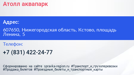 Атолл, аквапарк по адресу 607650, Нижегородская область, Кстово, площадь Ленина, 5 в дальнейшем Организация, размещена в следующих категориях: