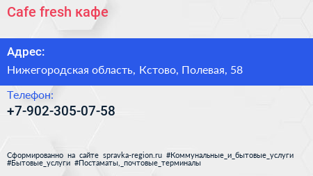 Cafe fresh, кафе по адресу Нижегородская область, Кстово, Полевая, 58 в дальнейшем Организация, размещена в следующих категориях: