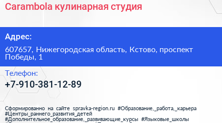 Carambola, кулинарная студия по адресу 607657, Нижегородская область, Кстово, проспект Победы, 1 в дальнейшем Организация, размещена в следующих категориях: