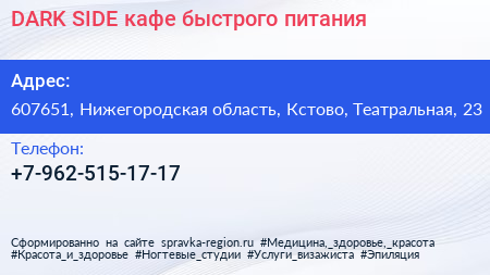 DARK SIDE, кафе быстрого питания по адресу 607651, Нижегородская область, Кстово, Театральная, 23 в дальнейшем Организация, размещена в следующих категориях: