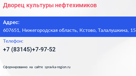 Дворец культуры нефтехимиков по адресу 607651, Нижегородская область, Кстово, Талалушкина, 15 в дальнейшем Организация, размещена в следующих категориях: