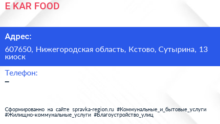 E-KAR FOOD по адресу 607650, Нижегородская область, Кстово, Сутырина, 13 киоск в дальнейшем Организация, размещена в следующих категориях: