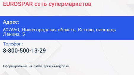 EUROSPAR, сеть супермаркетов по адресу 607650, Нижегородская область, Кстово, площадь Ленина, 5 в дальнейшем Организация, размещена в следующих категориях: