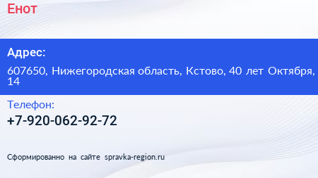 Енот по адресу 607650, Нижегородская область, Кстово, 40 лет Октября, 14 в дальнейшем Организация, размещена в следующих категориях: