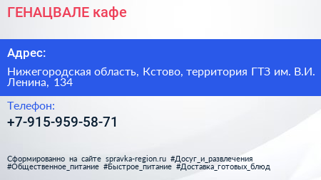 ГЕНАЦВАЛЕ, кафе по адресу Нижегородская область, Кстово, территория ГТЗ им. В.И. Ленина, 134 в дальнейшем Организация, размещена в следующих категориях: