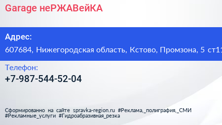 Garage неРЖАВейКА по адресу 607684, Нижегородская область, Кстово, Промзона, 5 ст11 в дальнейшем Организация, размещена в следующих категориях: