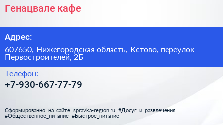 Генацвале, кафе по адресу 607650, Нижегородская область, Кстово, переулок Первостроителей, 2Б в дальнейшем Организация, размещена в следующих категориях: