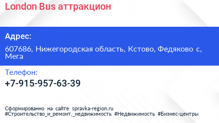 London Bus, аттракцион по адресу 607686, Нижегородская область, Кстово, Федяково с, Мега в дальнейшем Организация, размещена в следующих категориях: