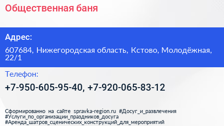 Общественная баня по адресу 607684, Нижегородская область, Кстово, Молодёжная, 22/1 в дальнейшем Организация, размещена в следующих категориях: