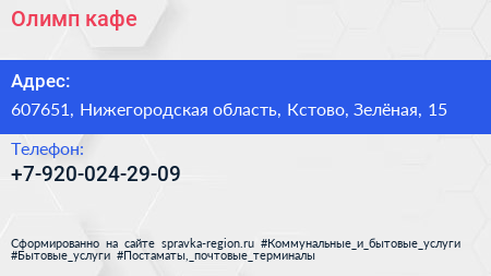 Олимп, кафе по адресу 607651, Нижегородская область, Кстово, Зелёная, 15 в дальнейшем Организация, размещена в следующих категориях: