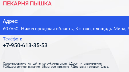 ПЕКАРНЯ ПЫШКА по адресу 607650, Нижегородская область, Кстово, площадь Мира, 5 в дальнейшем Организация, размещена в следующих категориях:
