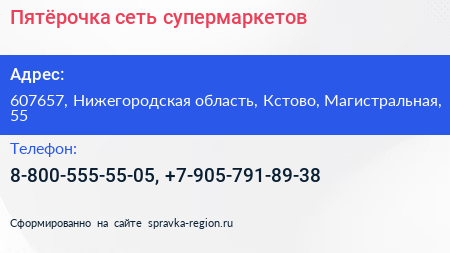 Пятёрочка, сеть супермаркетов по адресу 607657, Нижегородская область, Кстово, Магистральная, 55 в дальнейшем Организация, размещена в следующих категориях: