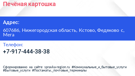 Печёная картошка по адресу 607686, Нижегородская область, Кстово, Федяково с, Мега в дальнейшем Организация, размещена в следующих категориях: