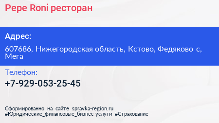 Pepe & Roni, ресторан по адресу 607686, Нижегородская область, Кстово, Федяково с, Мега в дальнейшем Организация, размещена в следующих категориях: