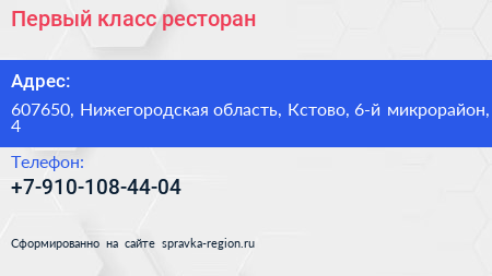 Первый класс, ресторан по адресу 607650, Нижегородская область, Кстово, 6-й микрорайон, 4 в дальнейшем Организация, размещена в следующих категориях: